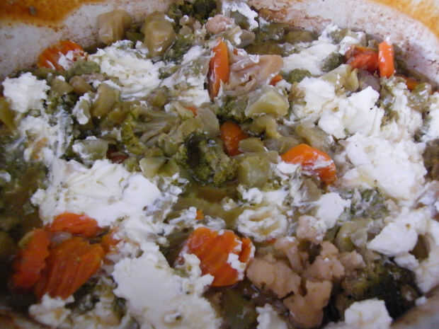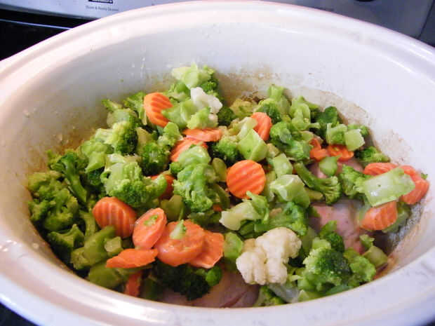 En su lugar encabezando el pollo con verduras mixtas antes de cocinar, cocinar pollo para 5-6 h luego añadir en verduras con crema de queso y fideos para otro 2 h. Verduras de esta manera no serán demasiado suave para algunos adultos.