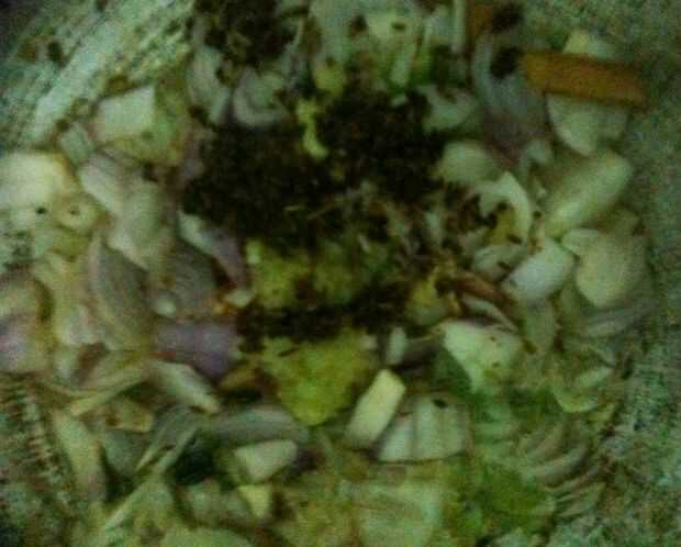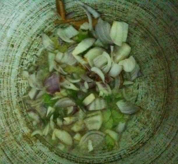 Añadir 2 cucharadas de pasta de jengibre y ajo, luego karapincha (hierba-opcional), canela, cebolla, semillas de cumming...