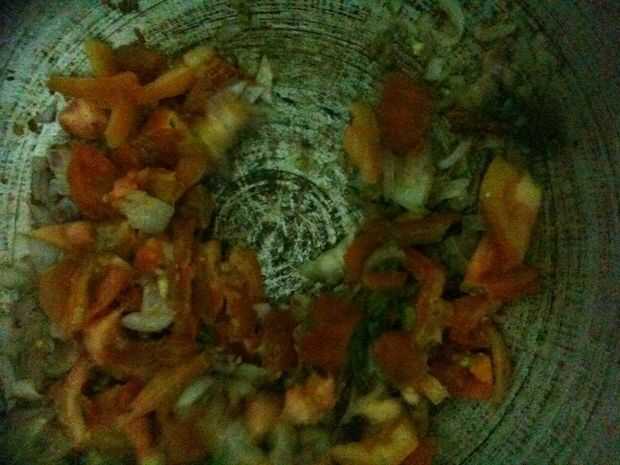 cocinar un poco... ahora, añadir los tomates y el chile verde y sal al gusto.