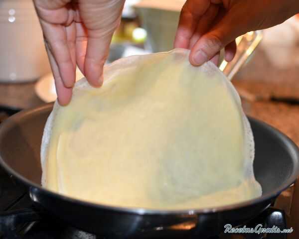 Para saber si es momento de voltear la crepa debes ver si en las orillas de ésta, se ve un poco "tostada", pues esto es un buen indicador de es momento de voltearla. El tiempo marca es de 4 min para voltearlo. Puedes apoyarte de tus manos para voltearla. Debes ser muy cuidadoso al voltearla y al sacarla de la sartén ya las crepas son muy delicada.