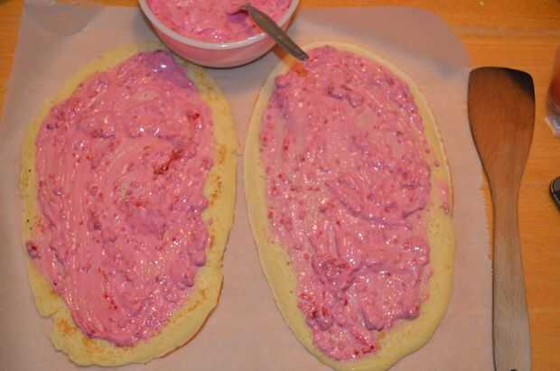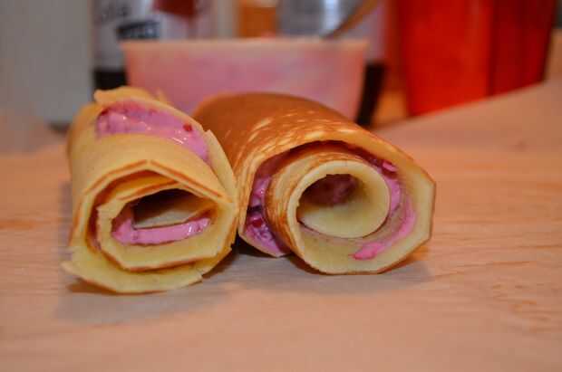 Ahora toma las tortitas y extender la crema sobre la superficie. No agregue demasiado, simplemente se terminan consiguiendo exprimido fuera de los rollos y hacer un gran lío. Rollo de las tortitas y luego cortar los bordes para deshacerse de la crepe de sobreposición. (Y otra vez: comer! ¡ Es increíblemente bueno!)