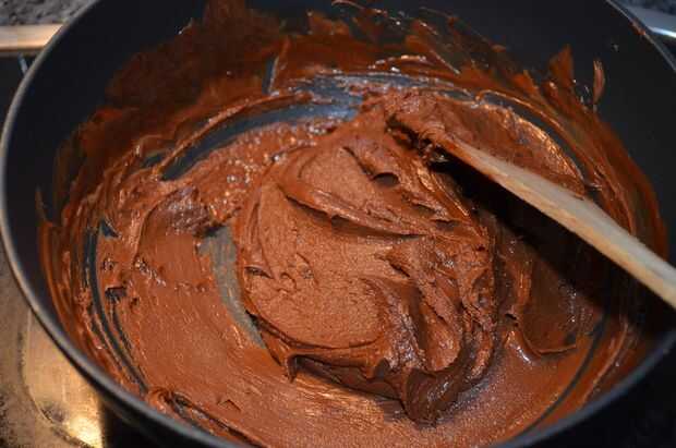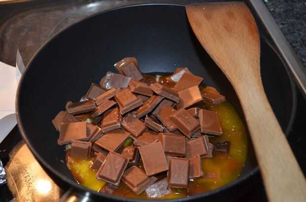 Derretir el chocolate con la mantequilla en una sartén a baja temperatura. Después de que deje que se enfríe hacia abajo un poco y en este tiempo baten los huevos hasta que estén suaves.