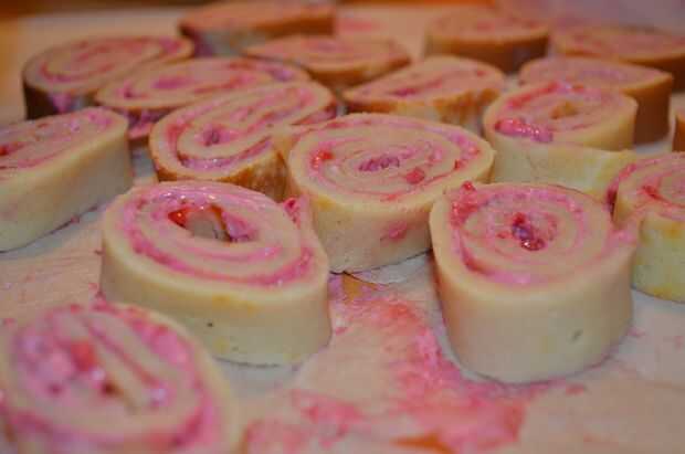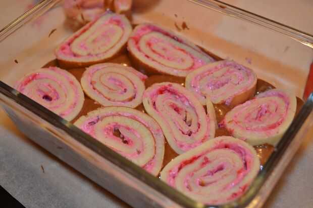 Ahora a las capas: primero una capa de masa de brownie, segundo una capa de rollos de tortilla y luego para acabarla nuevamente una capa de masa de brownie.