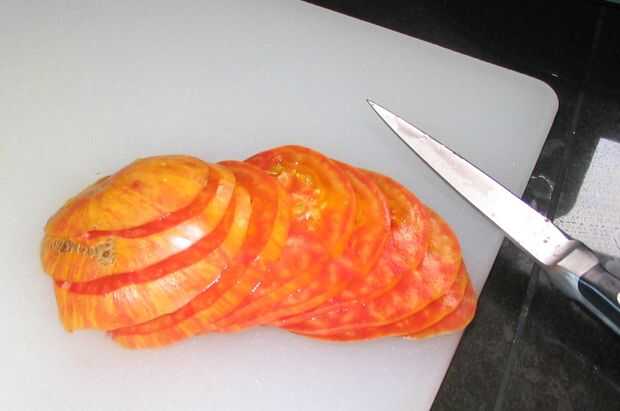 Encontrar una reliquia preciosa de tomate en el mercado local de agricultores. Córtela en rodajas grandes agradables. Fino rebanar una cebolla morada también.