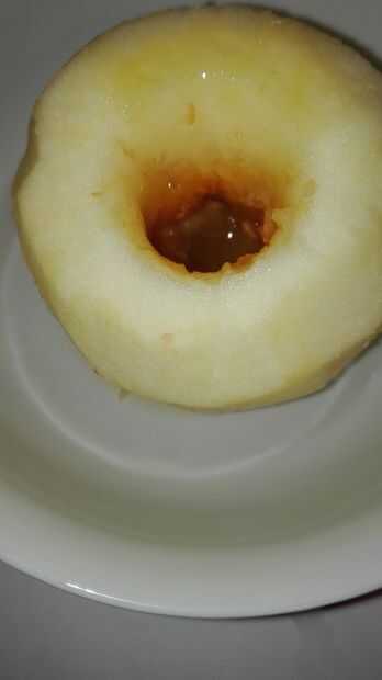 Pelar la manzana y hacer un agujero en el medio para quitar el tallo y la base. Llenar el hoyo con el edulcorante de elección y cubrir el fondo del recipiente con agua. Luego coloque la manzana en su interior.
