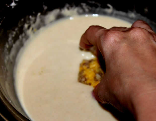 Saca de las mordeduras de desayuno el congelador si no lo has hecho ya. Sumergir las bolas heladas en crepes hasta que estén bien cubiertas. Porque es panqueque húmedo masa, no necesita hacer la base de una harina, huevo y masa. Ya se hacen y se queden muy bien!! Tiempo y el protector de plato sucio!