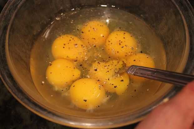 Crack al menos 6 huevos en un tazón grande. Añadir lo que quieras tus ingredientes para huevos revueltos. Si tienes la receta de la abuela, usarlo! Para mí, yo sólo uso huevos, sal, pimienta y un poco de leche. Batir los huevos hasta que se incorporen bien y ya no ves las yemas.