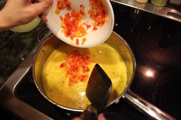 Añadir los pimientos a los huevos revueltos en una sartén grande y cocinero, cocinero, cocinero! Puede cocinar huevos revueltos con una espátula y tirando de los lados de los huevos poco a poco. Continuar hasta básicamente hacer una tortilla grande. Entonces, usando la espátula, romper la tortilla y le han hecho huevos revueltos. Si no está todavía seguro cómo hacer huevos revueltos, puede utilizar este instructivo con instrucciones paso a paso.