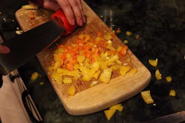 A continuación, tomar su selección de pimientos de colores y darles una buena sesión de picar. Asegúrese de quitar las semillas. Asegúrese y córtelos bien para que encajen en sus porciones de tamaño de mordedura. Si usted quiere que usted puede incluso utilizar un procesador de alimentos, recuerde que va a ser más limpio. No