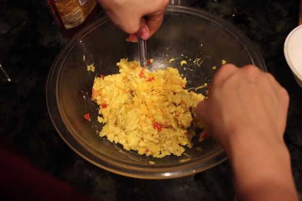 Ahora, vierte los huevos en un bol y mezclar en un poco de queso cheddar rallado. Puede ir picante y añadir pimienta gato o incluso algo más picante. Un buen queso a probar es chipotle gouda. Le dará tal patada con sabor increíble.