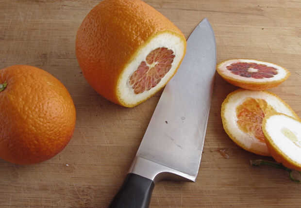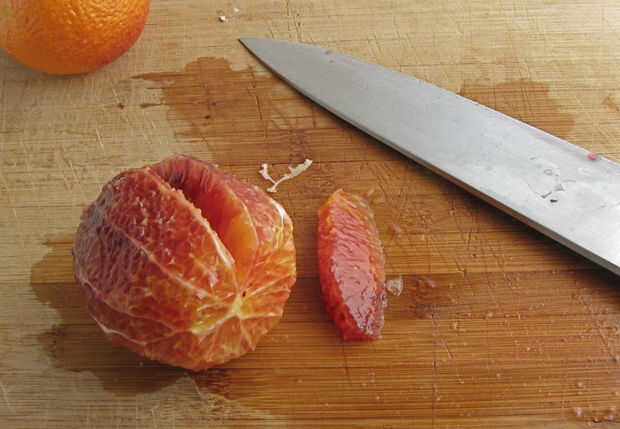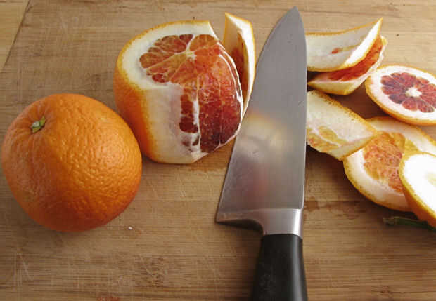 4. corte cada segmento a la izquierda y derecha para separar el segmento de la membrana. Al final tienes un montón de segmentos y algo como un libro de membranas cítricos.