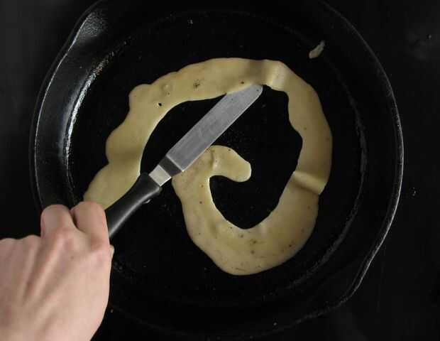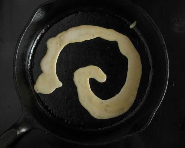 Colocar una superficie antiadherente o sartén de hierro fundido o plancha a fuego medio. Una capa ligera de la superficie con mantequilla. Aproximadamente la mitad de su masa de crêpe Vierta en una botella del apretón. (Llenado demasiado completo hace difícil controlar el flujo.) Generalmente tarda unos crêpes para asegurarse de que el pan está a la temperatura adecuada. Apriete rápidamente su masa de crêpe hacia fuera en espiral alrededor de la bandeja. Resultaba más fácil trazar alrededor del borde exterior de la cacerola entonces subir y hacer un pequeño gancho en el centro del círculo. Una vez tienes tu espiral dan la bandeja un batido rápido para ayudar disipe el crepe. Usted quiere su línea de crêpe que sobre una pulgada de ancho, pero no te preocupes de lo que es perfecto, esas pequeñas imperfecciones hará que tu look rosa orgánica.