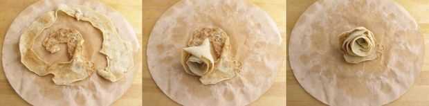 Establecer una de sus espirales de crepe sobre una superficie plana. A partir de en el exterior, enrollar la espiral hacia el centro. Comenzar a rodar bastante bien, pero se suavizan a medida que avanza. Cuando esté satisfecho con la apariencia de la rosa, darle la vuelta a su lado y corte un lugar plano para la rosa para sentarse. Establecer color de rosa en un plato para servir o en un plato caliente.