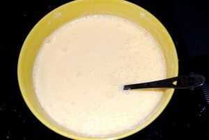 Vierta la leche y mezclar hasta u obtener una mezcla acuosa uniforme.