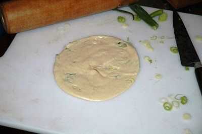 Crepe de cebollín chino 葱油饼Dificultad: fácilTiempo de preparación: 5 minutosTiempo de espera: 10 minutosTiempo de cocción: 6 minutosPorciones: 2Ingredientes:1 taza de harina para todo uso1/2 taza de agua caliente2 tallos de cebollitas verdes picadas1