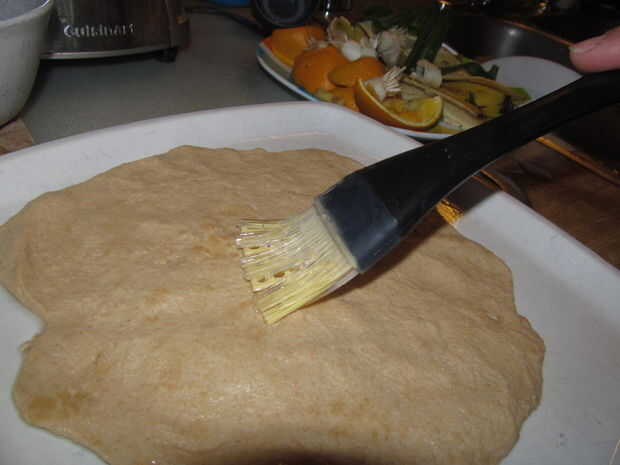 Por cuando llegues a la cebolla de verdeo picada, la masa debe hacer reposo. Sacar la masa y sección hacia fuera en pequeñas bolas de masa. Presione estas bolas planas. Se puede obtener de todo lujo y usar rodillos, pero uso el método menos técnico y usar mis manos. Pincelar la masa con aceite y espolvorear generosamente sobre la cebolla de verdeo. Yo también espolvoreado con sal aquí para mayor sabor. A continuación, rodar la masa hacia arriba y sobre la cebolla de verdeo. Su rollo rellenada de cebolla de verdeo y girar en espiral. Este proceso del balanceo/espiral permite la cebolla de verdeo a extenderse igualmente a lo largo de la masa. Finalmente, vuelva a pulsar la masa plana en forma de panqueque otra vez. Usted debe ser listo para freír las tortitas en este punto.