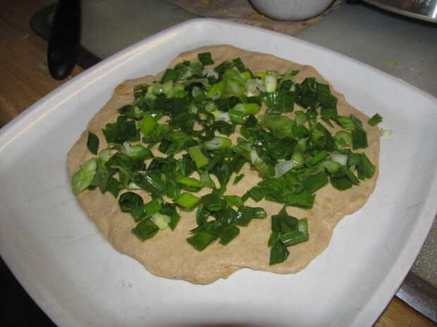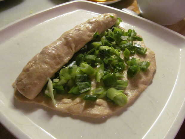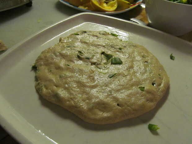 Crepe de cebollín chino 葱油饼Dificultad: fácilTiempo de preparación: 5 minutosTiempo de espera: 10 minutosTiempo de cocción: 6 minutosPorciones: 2Ingredientes:1 taza de harina para todo uso1/2 taza de agua caliente2 tallos de cebollitas verdes picadas1