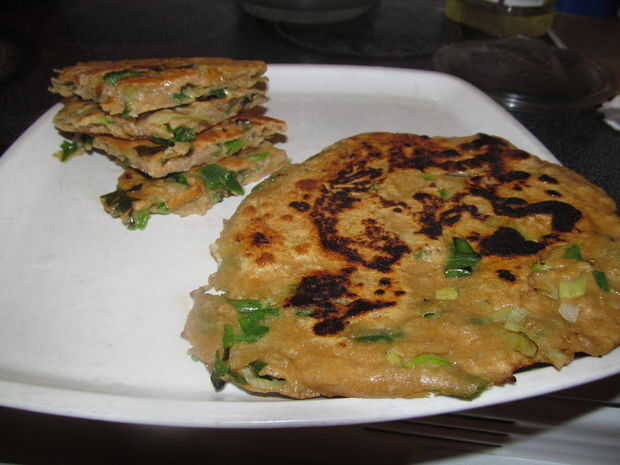 Crepe de cebollín chino 葱油饼Dificultad: fácilTiempo de preparación: 5 minutosTiempo de espera: 10 minutosTiempo de cocción: 6 minutosPorciones: 2Ingredientes:1 taza de harina para todo uso1/2 taza de agua caliente2 tallos de cebollitas verdes picadas1