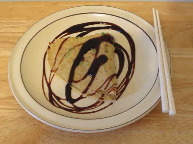 Le mostrará cómo hacer esta crêpe, pero por favor use su propia creatividad para mejorarlo. Puede poner muchas cosas dentro de esta tortita a su gusto! Sabrosa carne, sabrosas verduras, pescados y mariscos frescos! Deja que tu imaginación tome esta receta aún más!