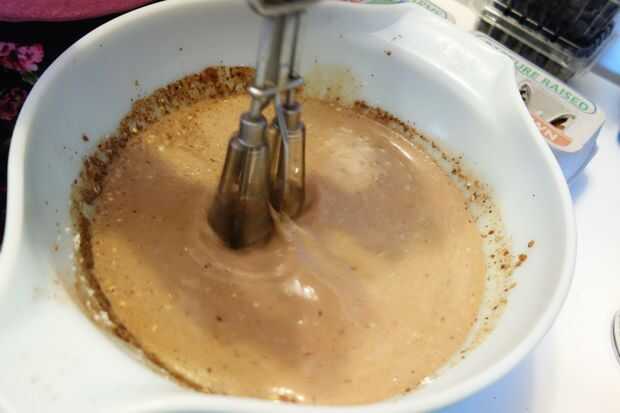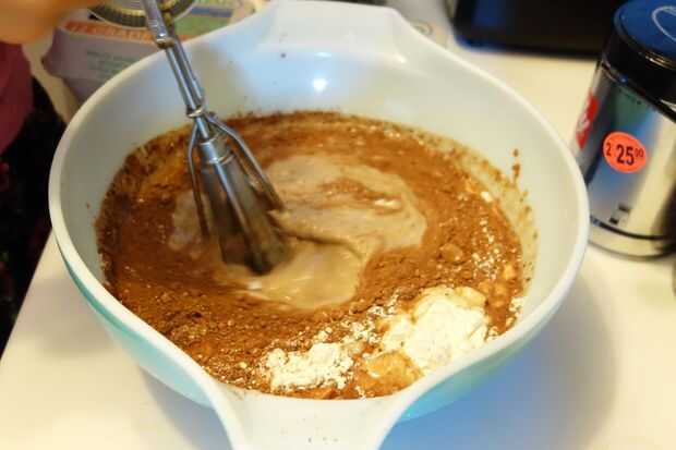 Después se mezclan con todos los ingredientes, use un eggbeater o una licuadora para mezclar la masa hasta que tenga una consistencia suave y agradable. No debería ser ningún grumos de harina, cacao en polvo o azúcar después de que has mezclado! Si se siente un poco espesa, puede Agregar un poco más de agua.
