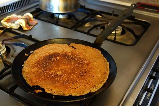 Si estás familiarizado con cocinar crepes normales, este paso es esencialmente el mismo, aparte del hecho de que porque la masa es de color marrón, es más difícil decir cuando se hace, por lo que necesitará prestar mucha atención. Una vez que la crepe se ha solidificado sobre todo y es un marrón un poco más oscuro (generalmente después de unos minutos), es el momento de darle la vuelta! Deslice una espátula debajo de la crepe y dale la vuelta. Después de la tapa, deje que la crepe cocinar durante 30 segundos o menos, hasta que los bordes estén ligeramente crujientes. Repita hasta que te quedas sin pasta!