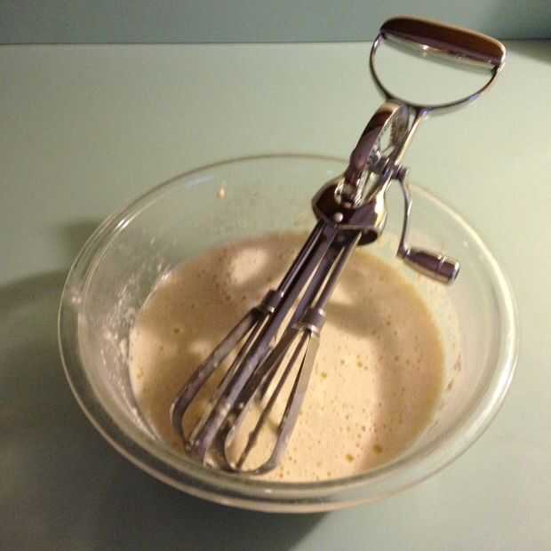 Añadir la leche y la harina de manera alterna a la mezcla de huevo. Mezclar bien.