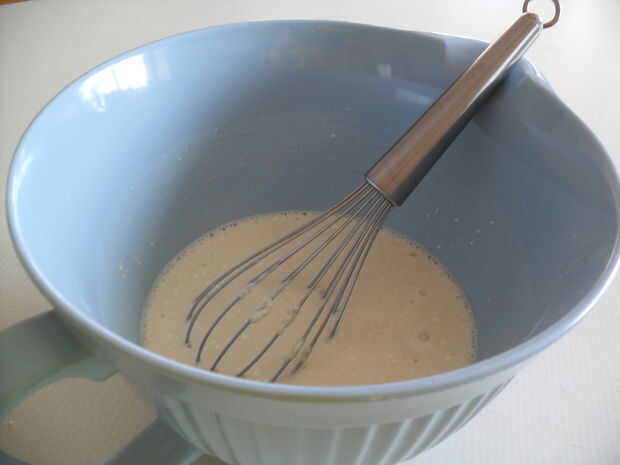 Añadir la harina y la sal para humedecer la mezcla. Batir los ingredientes hasta que no queden grumos.