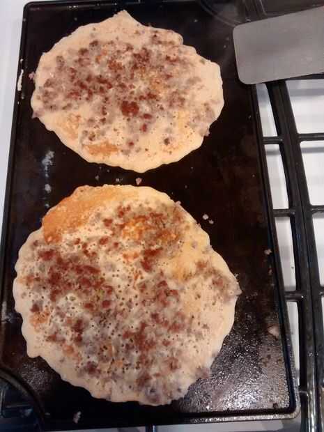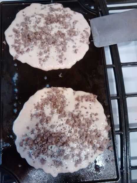 Voltear el panqueque cuando la parte inferior se dore bien. Dejar la cara de salchicha cocinar hasta Dora la salchicha encima y la tortita se ve sólida.