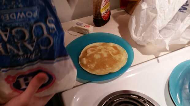 Ahora que la crepe se haya terminado, podemos agregar las cosas que todo el mundo ama los ingredientes! Crepes pueden utilizarse con un montón de ingredientes diferentes, puede Agregar fruta para postre, pollo y queso para una comida completa, o prácticamente cualquier otra cosa. Las crepes se pueden envolver alrededor de los ingredientes, o los toppings pueden colocarse simplemente sobre él. Ya que estamos haciendo esto para el desayuno, hemos añadido jarabe y en polvo de azúcar.
