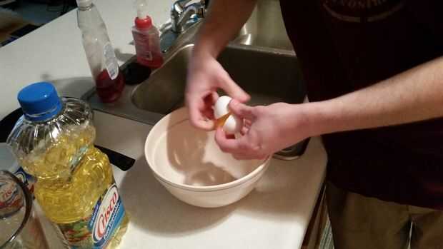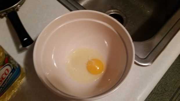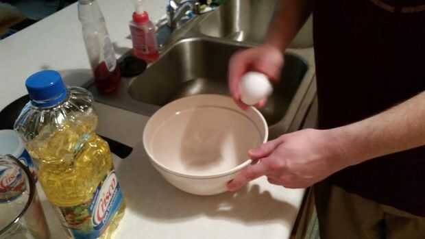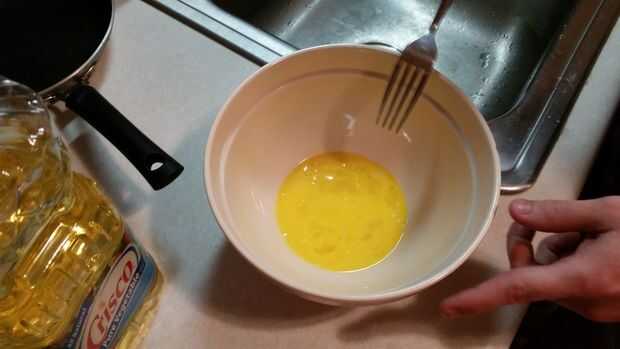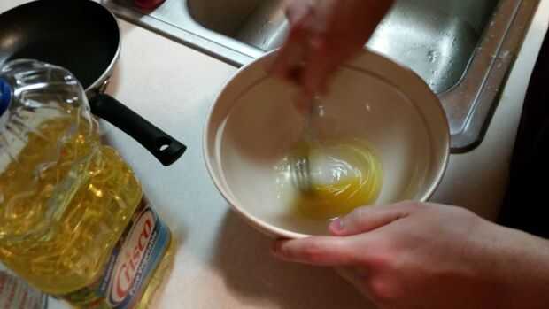Vamos a empezar con el huevo, tap en el bol o una superficie dura similar por lo que comienza a agrietarse. Ahora con ambas manos, abra el huevo en la grieta para que la yema y el blanco caen en el recipiente, pero no intentan meter cualquier cáscara en el Bol. Si hay cualquier shell en el recipiente, quitar con las manos o la horquilla. Ahora, tomar el tenedor y empezar a mezclar el huevo alrededor de hasta que la yema está rota y mezclada correctamente en.
