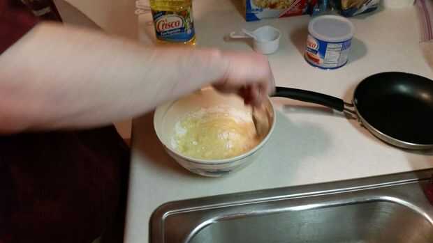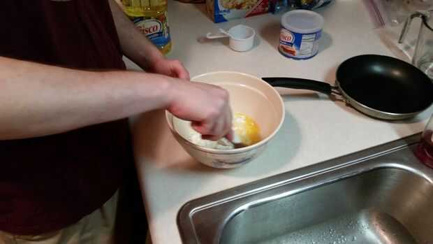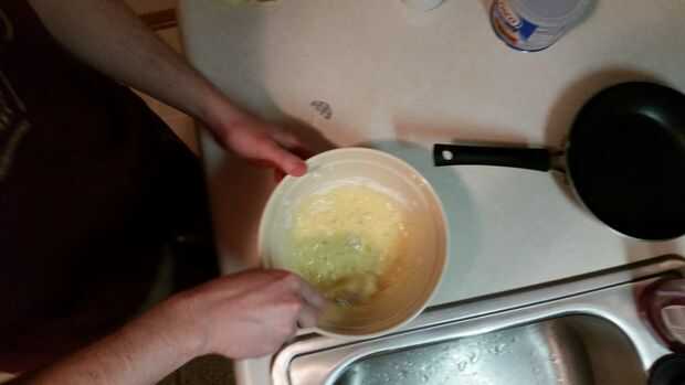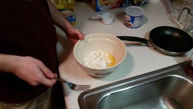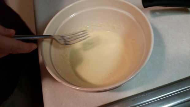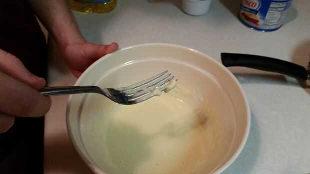 Ahora que tenemos todos los ingredientes en el tazón de fuente, necesitamos mezclarlos juntos. Tomar la bifurcación de antes, o un bate si prefiere y tirar y girar y mezclar todos los ingredientes hasta que se convierten en un solo color bronceado con una consistencia única. Si aún hay trozos, cuando esté listo como se muestra en la imagen, seguir mezclando hasta que los trozos se han ido, como se ve en la última foto.
