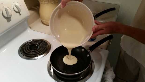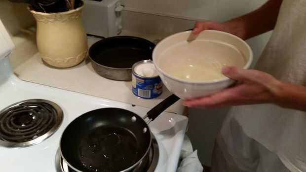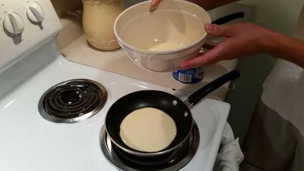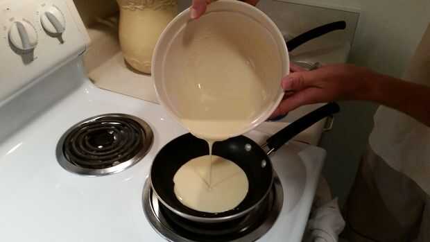 Ahora que el pan está caliente y engrasada, podemos empezar a cocinar la crepe. La parte derecha de un crepe es muy importante y puede ser complicado. Comenzar lentamente, verter la mezcla en la sartén, observar cuidadosamente como se extiende a los bordes de la olla y cuando es sólo de 6-7 pulgadas a través de, deje verter la mezcla. La mezcla se separe algunos después de que ha dejado de verter, así que ten a. Si el crepe es demasiado grueso, no se cocinará correctamente y puede llegar a ser más como un panqueque, si el crepe es demasiado grande, será difícil dar la vuelta con la espátula.