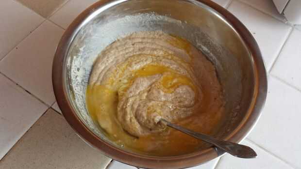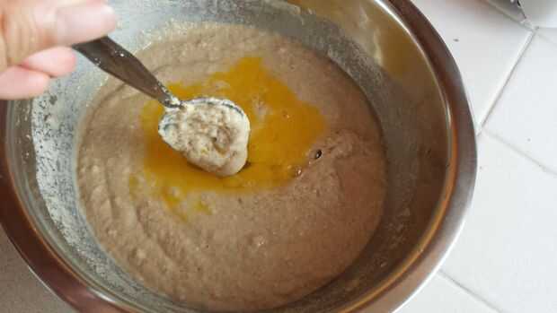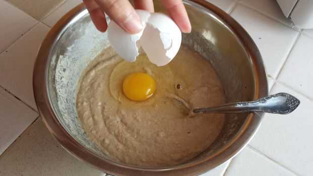 Suavemente el huevo para el rebozado de la grieta. Utilizar la cuchara para romper la yema de huevo y se mezcla con la clara del huevo primero antes de mezclar el huevo con la mezcla; Esto garantiza una mezcla más homogénea.