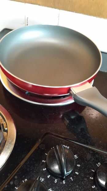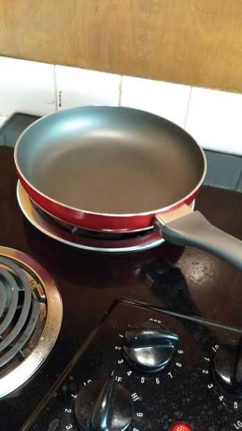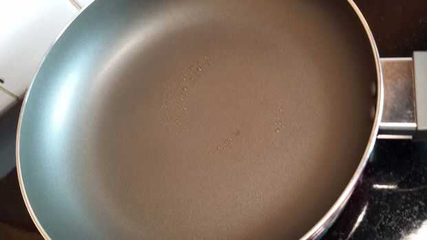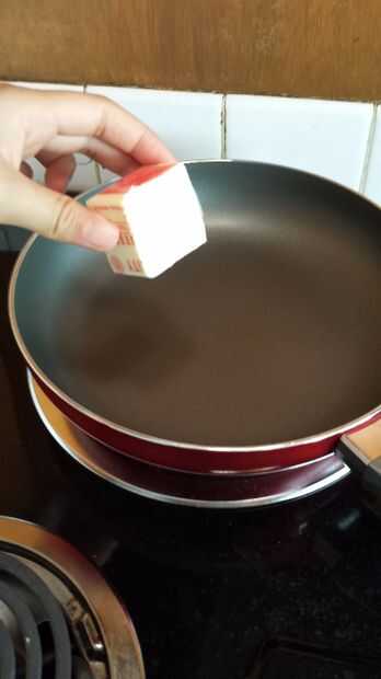 Poner la cacerola en la estufa y ponerlo en alto. Después de un minuto o dos, convertirlo a fuego medio y rápidamente dibuja un círculo en él con su mantequilla. Suavemente debe chisporroteo.