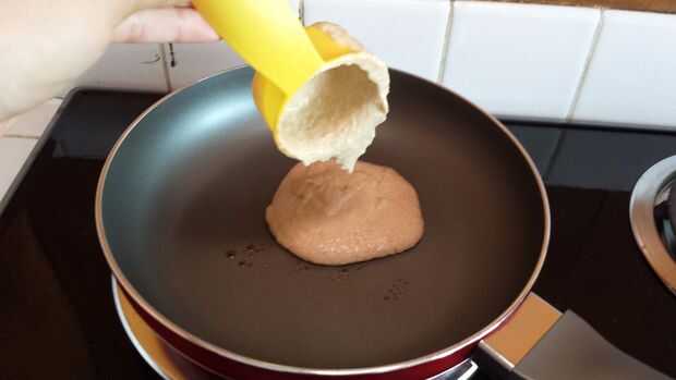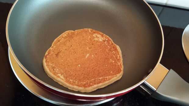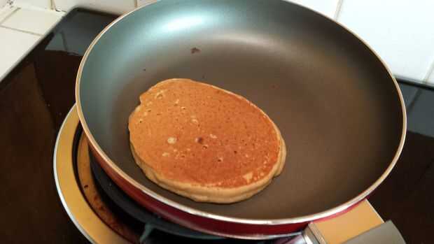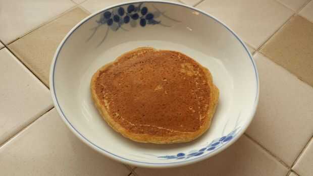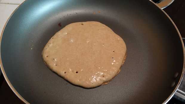Tiempo para la diversión parte! Coge la taza de 1/4 taza de medición y saquen alguna masa en la sartén. Espere aproximadamente un minuto o hasta que han aparecido unos cuantos agujeros/burbujas en la parte superior (segunda foto de arriba) hasta que voltearla con cuidado. Si el panqueque no parece oro marrón (tercera foto de arriba), dejar cocinar treinta segundos o así que ya antes los bancos. Después de otro minuto o así, del tirón para comprobar color; Si no dorado, dejar solo por un poco más. Si diapositiva marrón, oro que en un plato antes de sacar con pala más rebozar en el pan.