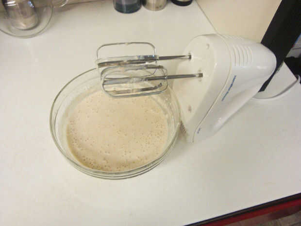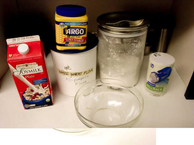 Mezcla de leche de soja, agua, harina, harina de trigo, maicena y sal en el procesador de alimentos o licuadora. Usé una batidora de mano, que trabajó muy bien. La mezcla es Aguada.