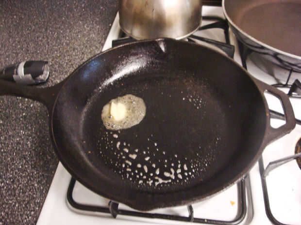 Calentar la sartén de hierro fundido. Está listo cuando usted puede película de agua en la superficie y el agua chisporrotee.