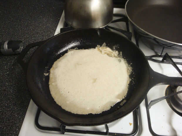 Verter entre 1/3 y 1/2 mezcla de c. sobre el pan. Con un agarrador, rápidamente recoger la bandeja y agitar la mezcla alrededor de extender uniformemente y fino alrededor de la bandeja. La forma de la meta aquí es un círculo.