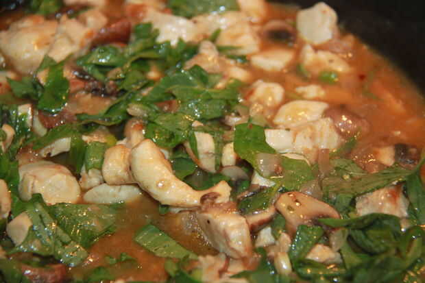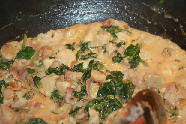 Dejarlos cocer en su propio jugo, de añadir las espinacas y la nata. Deje cocer durante otros pocos minutos de añadir la crema agria.