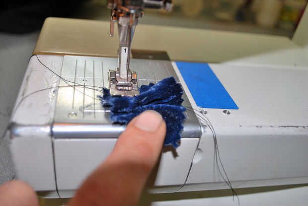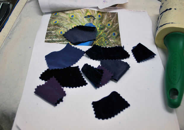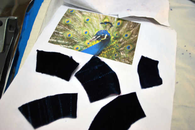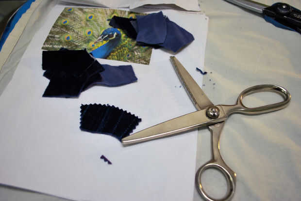 Cortar formas de ventilador de los retazos de terciopelo de seda de vestir el cuerpo de pavo real y la cabeza. Yo sabía que quería una textura de pluma en la parte superior de cada ventilador pequeño, así que planeé el deshilachado de los bordes de la tela. Terciopelo batallas mucho, sin embargo, y no quería que los aficionados a derrumbarse. Así que volver a cortar los bordes superiores y laterales con tijeras dentadas. Los cortes de zig-zag que llegar con tijeras dentadas para mantener a tela bordes de desgaste demasiado rápido.