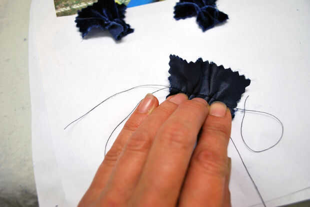 Después del corte, me sacó de mi aguja e hilo y cosió un punto de encuentro en la parte inferior de un ventilador de terciopelo de seda. Luego tiró firmemente el hilo y nudos apagado. Esto controla los frunces hasta que pude tomar el ventilador pequeño para la máquina de coser. I máquina cosido el borde se reunieron hacia adelante y hacia atrás un par de veces, entonces cortada de los hilos en exceso. Voila! Un ventilador de terciopelo wee! Entonces se reunieron y había cosido 11 más de ellos.