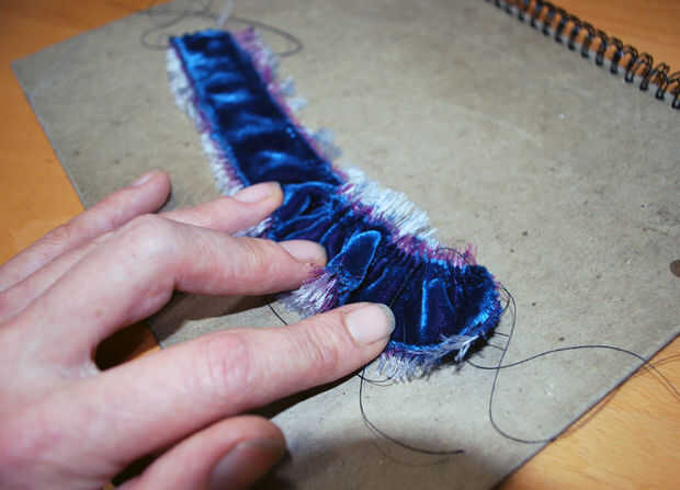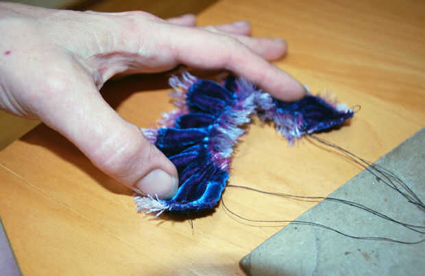 Aunque parecía un poco escasa. Las plumas individuales que hice fueron separadas un poco demasiado lejos aparte para hacer el efecto que quería. La forma era buena, pero quería algún relleno. Vuelta a los trozos de terciopelo de seda!