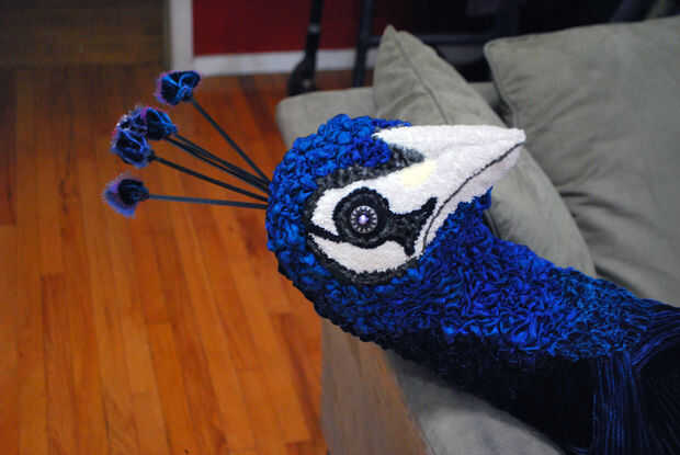 Colocar las plumas en la cabeza del pavo real fue un reto. Penetra los agujeros en la parte superior de la cabeza con mi punzón, pero que no me da suficiente espacio para empujar las plumas en. El pájaro fue relleno firmemente con bateo de almohada y no pasan los extremos. I utilizar mis tijeras para cortar ranuras, algunos de bateo sacó con pinzas y empujó cada pluma en su agujero con un destornillador de cabeza plana para ayudar a guiar el cable termina en su lugar. Una vez en la primera pluma, usé hilo resistente para coser a través de los agujeros que asomó en la corbata y fije a la tela de la cabeza todo el camino alrededor de su base.
