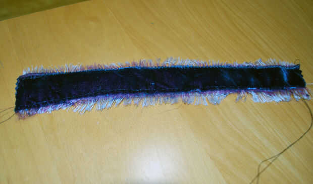 Corté una tira larga de terciopelo con las tijeras dentadas, aproximadamente dos veces al ancho del área quería cubierta y 1/2" más alto que los pequeños fans de pluma. He cortado una segunda pieza de terciopelo de la misma forma y los cosieron en la máquina de coser con una puntada de zig-zag estrecho. Cosí utilizando un margen de costura de 1/2". Luego sacó la cartulina y la lezna y consiguió que se deshilache el terciopelo. Quería un borde de aspecto bueno, pluma en la parte superior e inferior, así que raído hasta justo por encima de lo zig-zag.