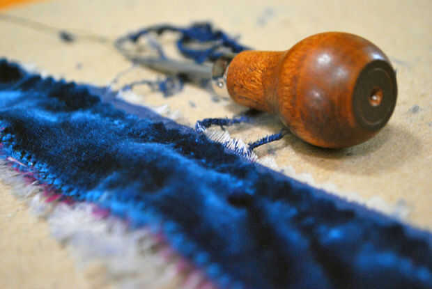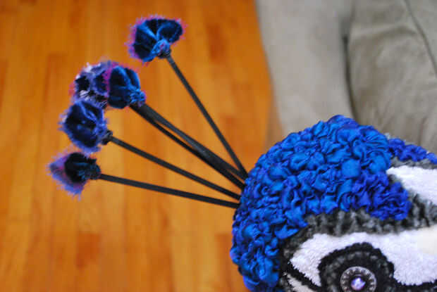 Una vez limpiado todo el lío aterciopelado, usé la máquina de coser para hacer un encuentro de la puntada en el borde inferior. En lugar de utilizar una puntada recta, zig-llegamos sobre un pedazo de hilo resistente. Esto dejó me hacen un agradable y apretado se reúnen sin necesidad de romper a la mitad de mi hilo. Luego anudado de los hilos de rosca, recortar el exceso y nos dispusimos fijar el volante a las plumas de la cabeza.