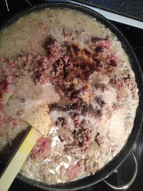 Ahora añadimos las especias, sin miramientos descarga todo y revolver. Tomar otro momento para tratar de romper cualquier grumos grandes de carne de cerdo, me encuentro con un machacador de papas muy eficiente con tanta carne.