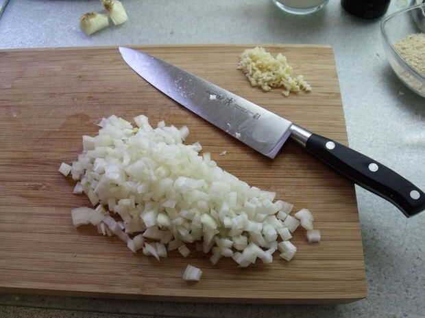 Cortar la cebolla y el ajo para yum óptimo. Prefiero mi ajo picado muy finos, y los trozos de cebolla no tienen que ser mucho más pequeño que un guisante.