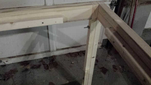 Empernaron el lado y los extremos juntos para hacer de esta criadora plegable y fácil de almacenar. Como se puede ver en las fotos usé algunas de las piezas sobrantes de 2x2s para crear un borde de la puerta de acceso superior en. Estos simplemente fueron atados a la 2x4s superior. En la segunda foto que se puede ver un pequeño espacio que he dejado entre dos piezas, se trata de una hoja de madera contrachapada a deslizarse entre crear secciones más pequeñas de la criadora según sea necesario.