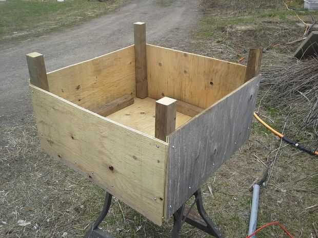 Desde la parte inferior de la pieza superior es 1" abajo, cuando ponen las patas en la caja habrá 4" que se extienden más allá de las piezas laterales. Este es el espacio que desea para sus pollos (según el artículo enlazado más arriba), por lo que puede ir y esconderse de los adultos y retienen el calor. Menciona que puede añadir extensiones a las piernas para levantar más alto a medida que envejecen. Yo no he llegado allí todavía. Cuando lo hago, va un 2 x 4 y 4" cuadrados para levantarla 2" en un momento.