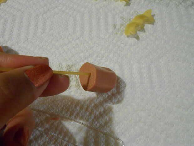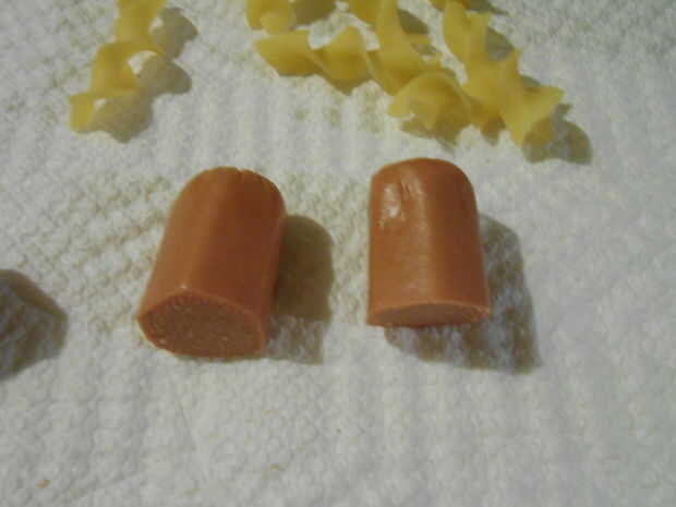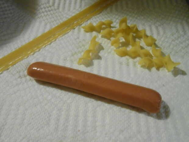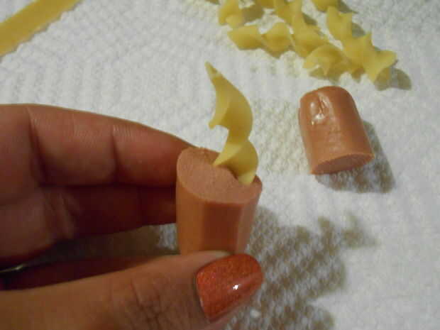Sólo se cortan los extremos redondeados de un hot dog como cuerpo y cabeza de tus amigos de pescados de jalea. Debe ser aproximadamente una pulgada. Los fideos spaghetti solo stick derecha en el lado cortado de las piezas del perrito caliente. Empuje los espaguetis, casi a la cima y luego romper en unos 2-3 pulgadas de largo. Perforar tantos en lo que pueda. Cuanto más mejor.